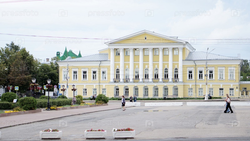 Городская архитектура желтого здания с колоннами