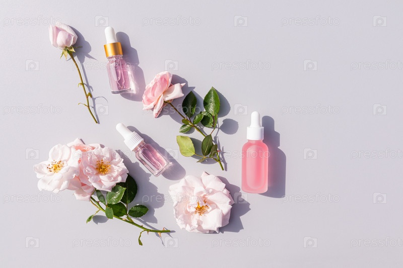Три разных косметических флакона с капельницей с маслом и продуктом на основе масла лепестков роз на сером фоне с цветами. Вид сверху. Плоская планировка