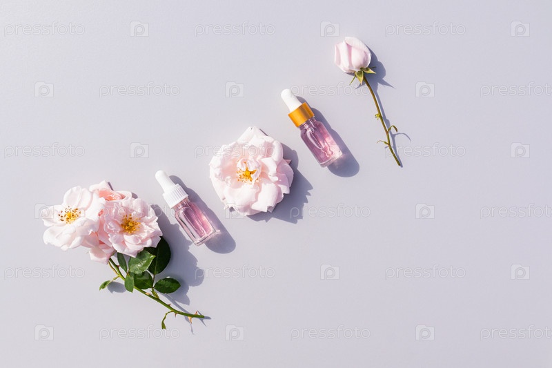 Плоская диагональная планировка на сером фоне косметических флаконов с капельницей с розовым маслом и цветами роз. Косметический домашний уход. скопировать пространство