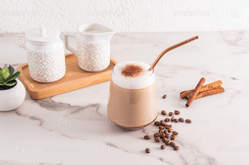Большой стакан свежесваренного кофе, капучино или латте с корицей на мраморном столе с ингредиентами для приготовления. Вкусный десерт