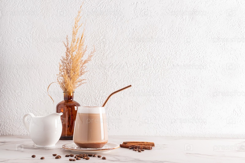 Красивый стильный натюрморт с большим стаканом свежезаваренного кофе капучино, кувшином молока, кофейными зернами и модной вазой с сухими ветками