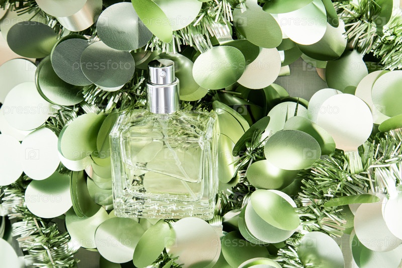 Стильный флакон духов или спрей на фоне яркой новогодней блестящей мишуры. Новогодний подарок. Пустая упаковка