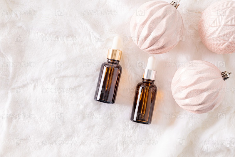Две косметические бутылочки с капельницей с натуральным средством ухода за собой на фоне белого меха с элегантными елочными шарами. Копия помещения