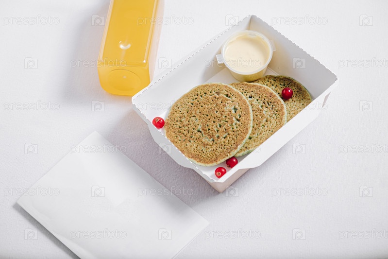 Блины с ягодами и сливками в белой таре