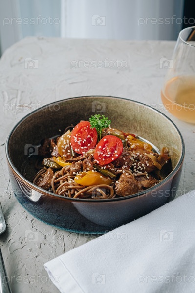Лапша с говядиной, овощами, помидорами черри и кунжутным соусом на глубокой тарелке, вид сбоку