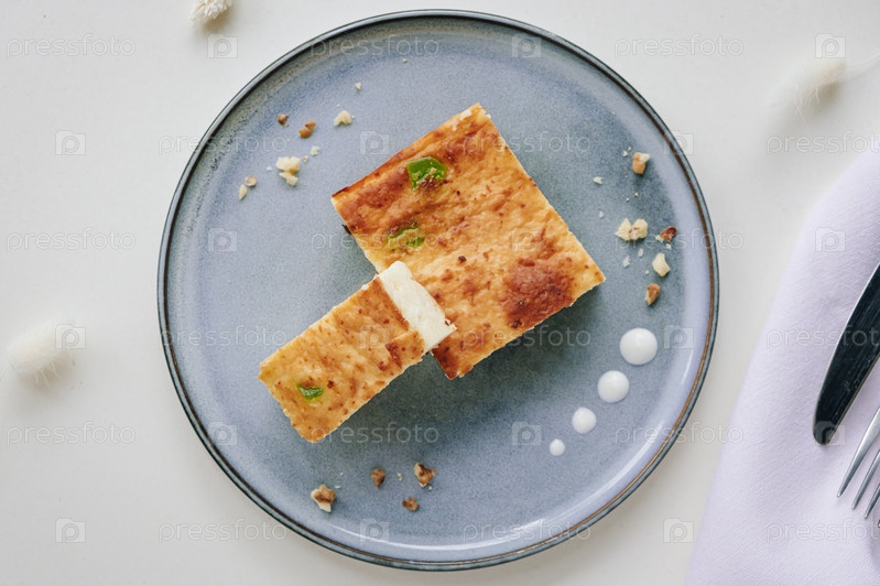 Нежная десертная творожная запеканка на светлом фоне, вид сверху