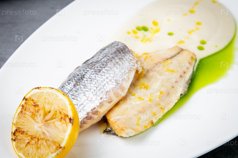 Кусочки жареной рыбы с соусом и жареным лимоном на белой тарелке, вид сбоку