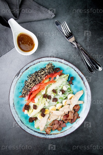 Закуска из мяса, перепелиных яиц, болгарского перца, гренок, салата и соуса на синей тарелке, вид сверху