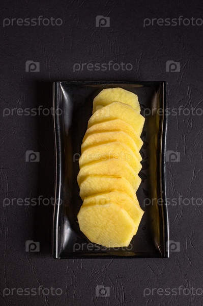 Ломтики картофеля на черной тарелке. Вид сверху. Китайская кухня, ингредиент для тушеного мяса