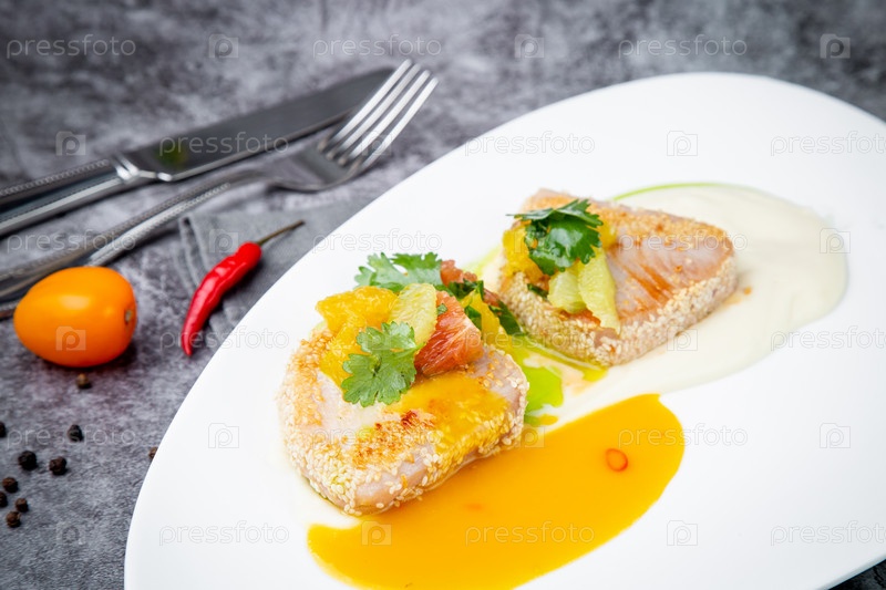 Рыба с мандаринами, петрушкой и кунжутом, вид сбоку