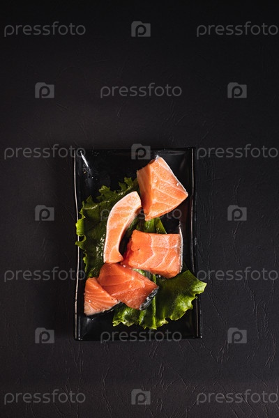 Мясо красной рыбы лосося на черной тарелке. Китайская кухня, ингредиент тушеного мяса