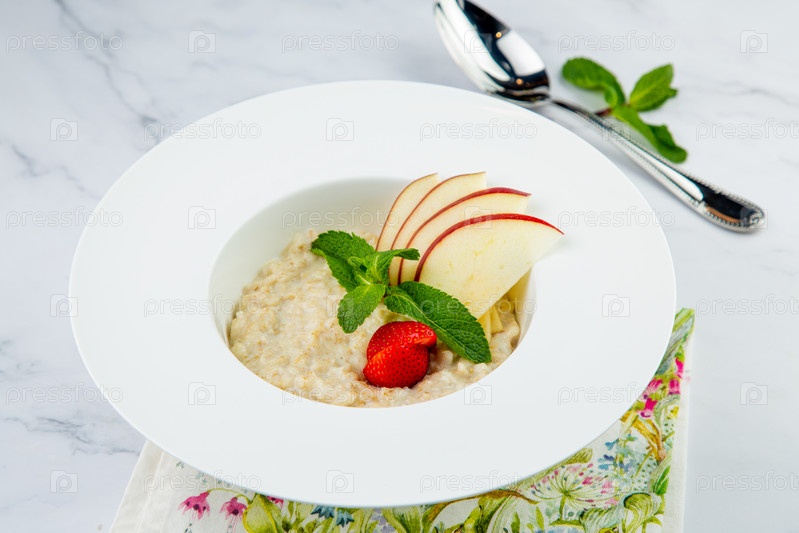 Овсянка с тонко нарезанными яблоками, клубникой и мятой на белой тарелке, вид сбоку