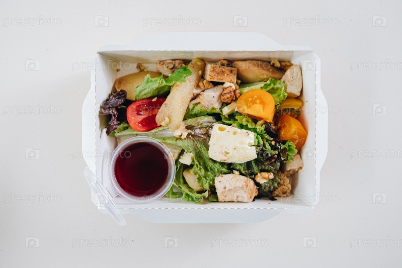Еда в контейнерах. правильное питание, ежедневный рацион, похудение. салат с курицей, зеленью, помидорами и орехами. Вид сверху