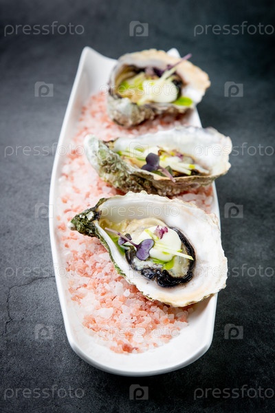 Свежие устрицы на соли Красного моря на белой тарелке
