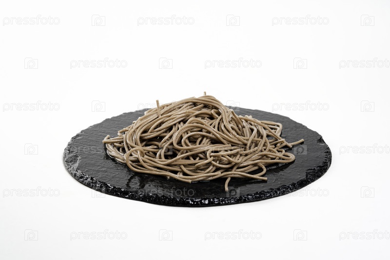 Гречневая лапша на черной тарелке с соевым соусом. Китайская кухня, ингредиент тушеного мяса