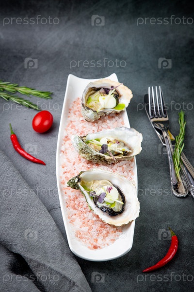 Свежие устрицы на соли Красного моря на белой тарелке