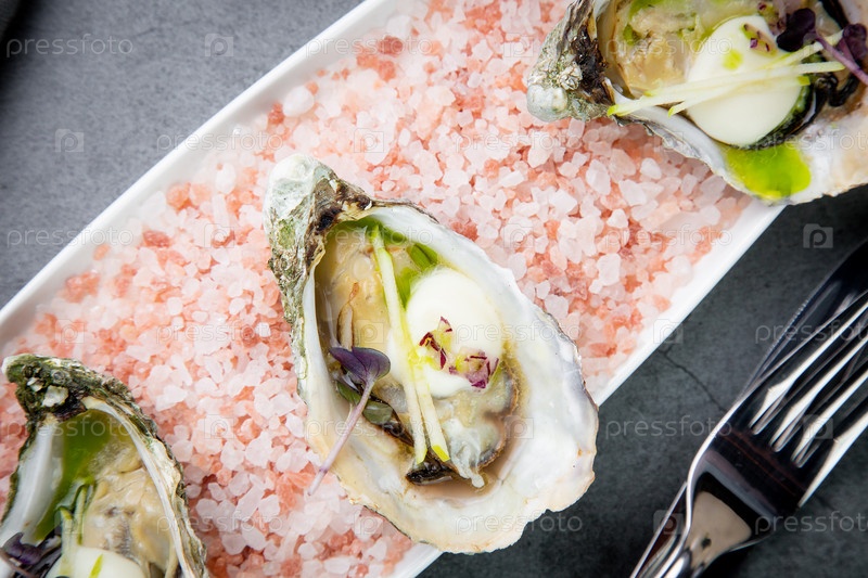 Свежие устрицы на соли Красного моря на белой тарелке, вид сверху