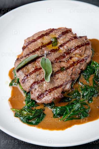 Стейк из говядины с соусом и зеленью на белой тарелке