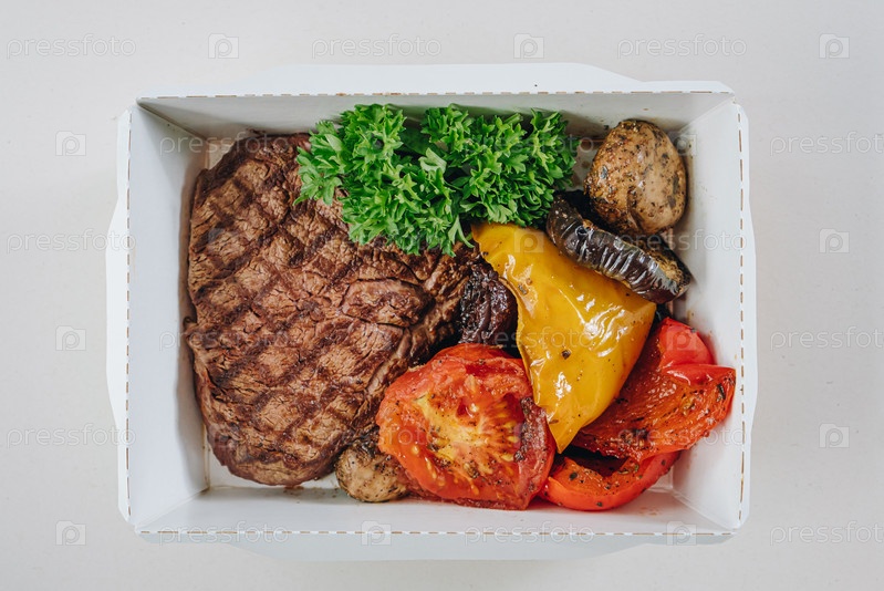 Еда в контейнерах. правильное питание, ежедневный рацион, похудение. стейк из телятины с овощами гриль. Вид сверху
