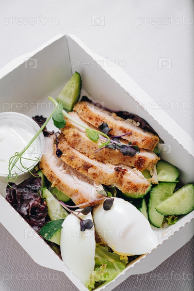 Кусочки курицы с овощами, зеленью и соусом в ланчбоксе