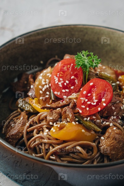Лапша с говядиной, овощами, помидорами черри и кунжутным соусом на глубокой тарелке, вид сбоку