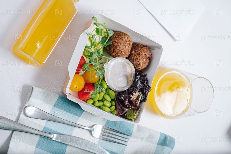 Миска в китайском стиле. фрикадельки с фасолью, зеленью, помидорами черри и соусом в контейнере