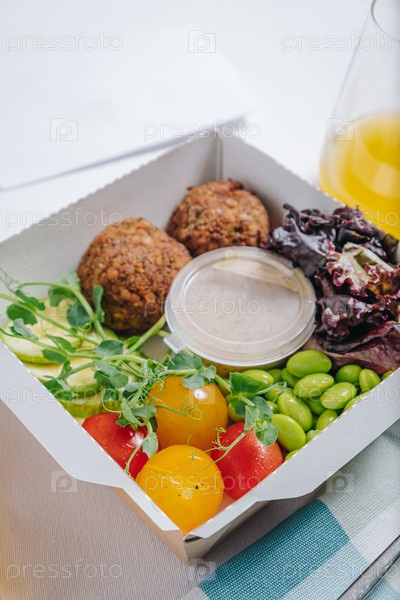Миска в китайском стиле. фрикадельки с фасолью, зеленью, помидорами черри и соусом в контейнере