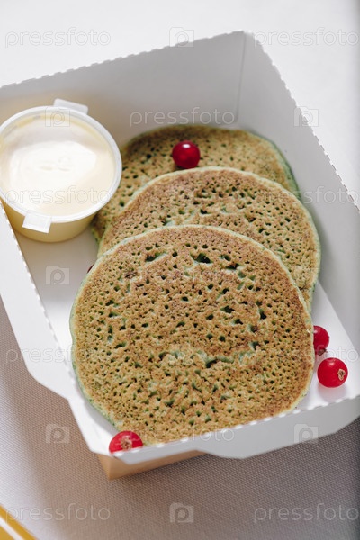 Блины с ягодами и сливками в белой таре