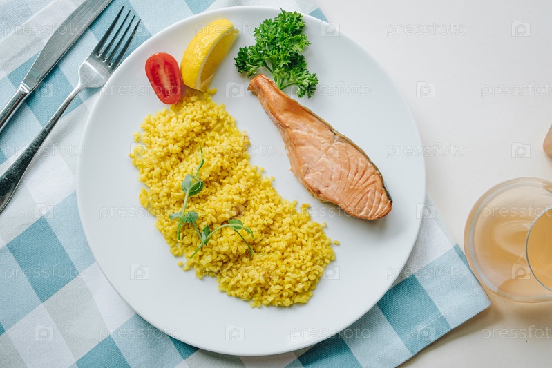 Правильное питание, ежедневный рацион, похудение. зелень, помидоры, стейк лосося с лимоном и гарниром из кускуса на тарелке. Вид сверху