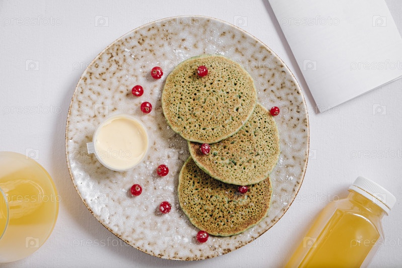 Блины с ягодами и стаканом сока на светлом фоне