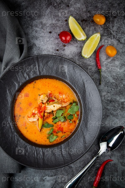 Суп том ям с курицей, лаймом, помидорами черри и петрушкой, вид сверху