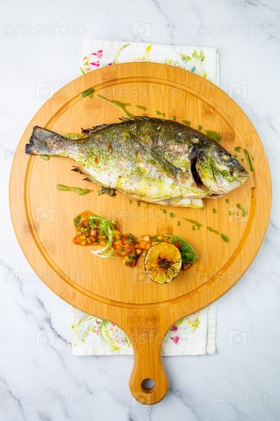 Запеченная рыба со специями и лимоном на деревянном подносе, вид сверху