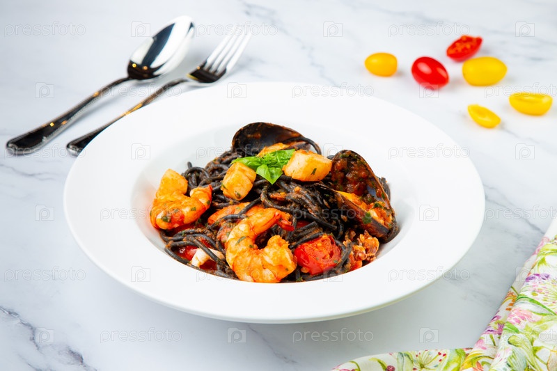 Черная лапша с мидиями, креветками, помидорами и зеленью, вид сбоку