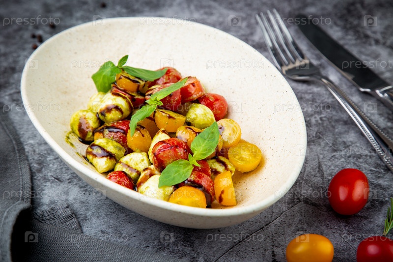 Салат из желтых и красных помидоров черри разных сортов с видом сбоку трав