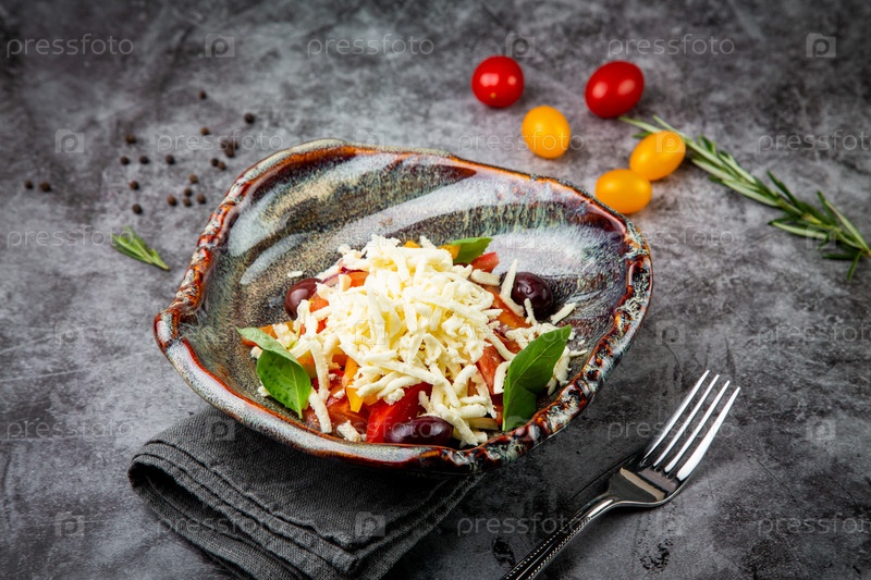Салат с помидорами, базиликом, сладким перцем и сыром, вид сбоку