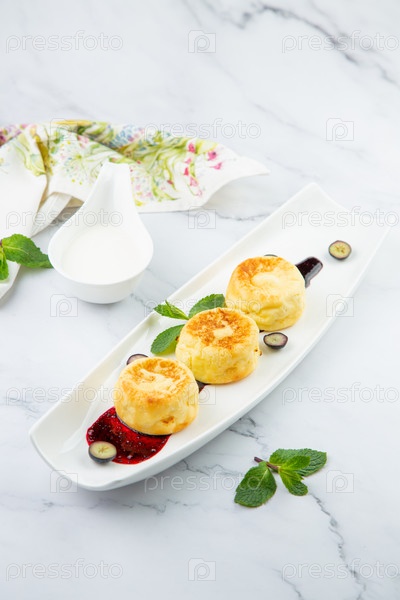Пышные и высокие чизкейки с вареньем и мятой на белой тарелке, вид сбоку
