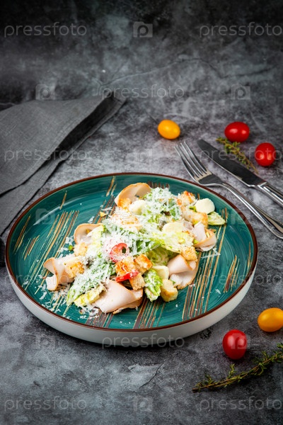 Вид сбоку салата Цезарь с сыром на синей тарелке