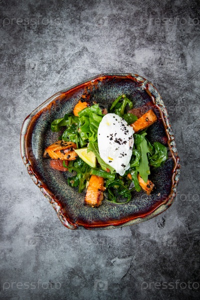 Салат с красной рыбой, зеленью и лаймом, вид сверху