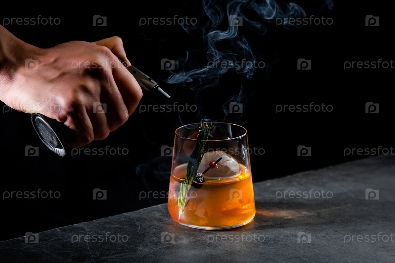 Ароматный коктейль с веточкой хвои и круглым льдом на темном фоне, вид сбоку