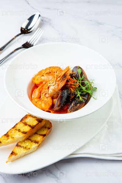 Приготовленные креветки с травами и мидиями на белой тарелке, вид сбоку