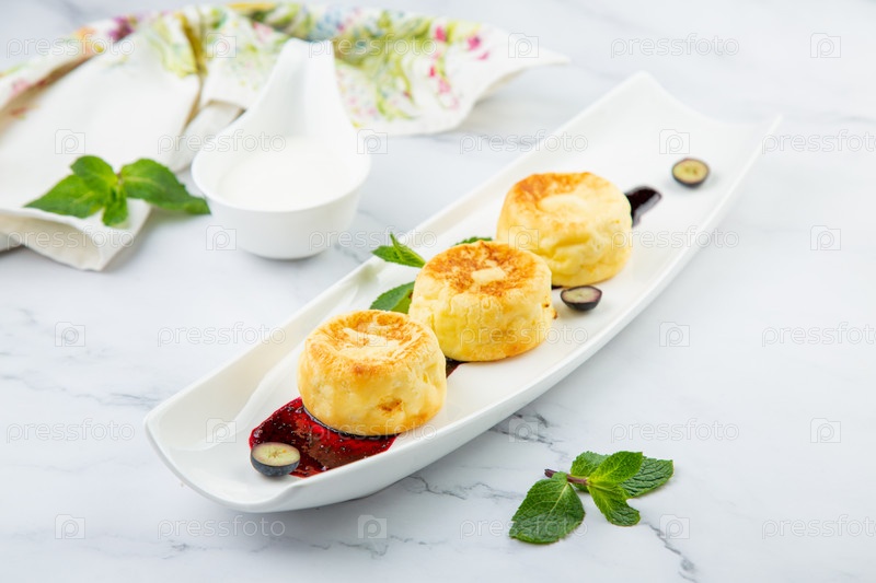 Пышные и высокие чизкейки с вареньем и мятой на белой тарелке, вид сбоку