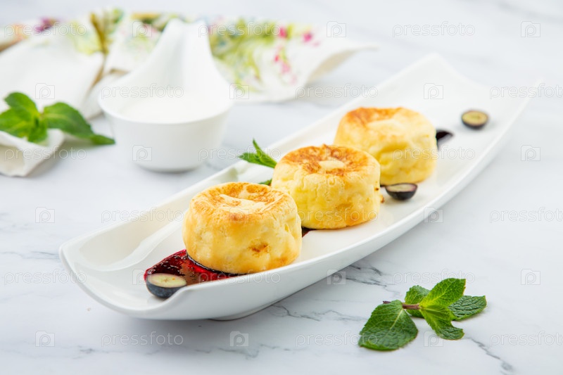 Пышные и высокие чизкейки с вареньем и мятой на белой тарелке, вид сбоку