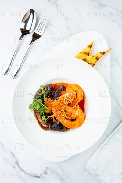 Приготовленные креветки с травами и мидиями на белой тарелке, вид сверху