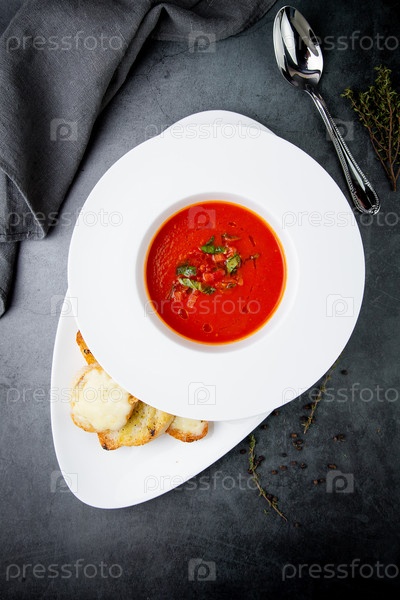 Крем-суп из красных томатов с зеленью и поджаренным хлебом, вид сверху