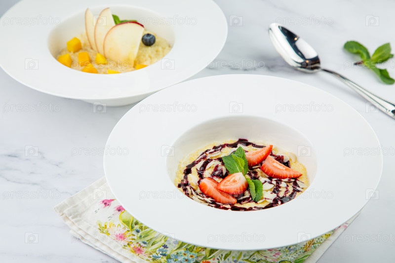 Каша с клубникой, мятой и ягодным вареньем в белой тарелке, вид сбоку