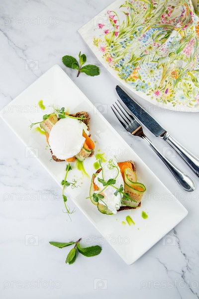 Канапе на черном хлебе с сыром, красной рыбой, зеленью и огурцом, вид сверху
