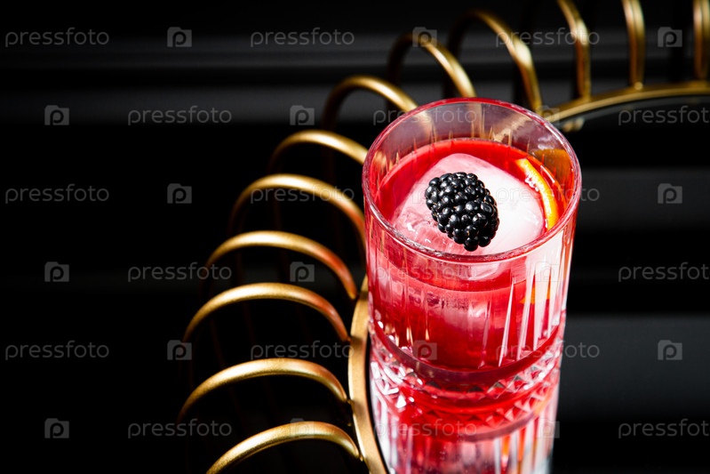 Красный коктейль с ягодным сиропом и круглым льдом с видом сбоку ежевики