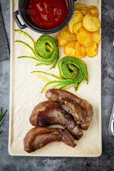 Говяжье мясо с чипсами, огурцами и соусом барбекю, вид сверху