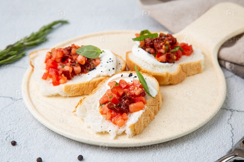 Брускетта с помидорами и сыром лабне на светлом фоне