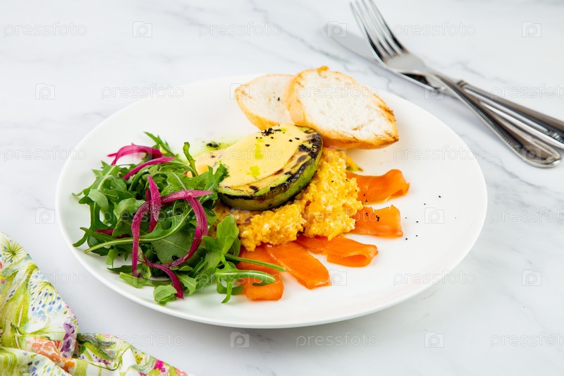Смесь лосося, салата из рукколы, белого хлеба и запеченного авокадо с сыром. Светлый фон